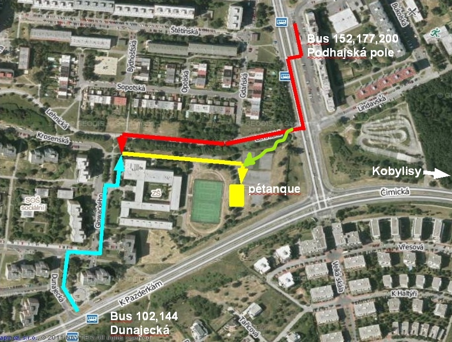 Kromě zimních měsíců se scházíme každou středu a pátek od 14 hodin na hřišti ZŠ Glowackého 555/6, Praha 8. Naše hřiště pro pétanque je na mapce vyznačeno žlutou barvou. Barevně jsou vyznačeny cesty od autobusových zastávek. Všechny použitelné autobusové linky (102, 144, 152, 177 a 200) mají zastávku u metra Kobylisy (linka C).